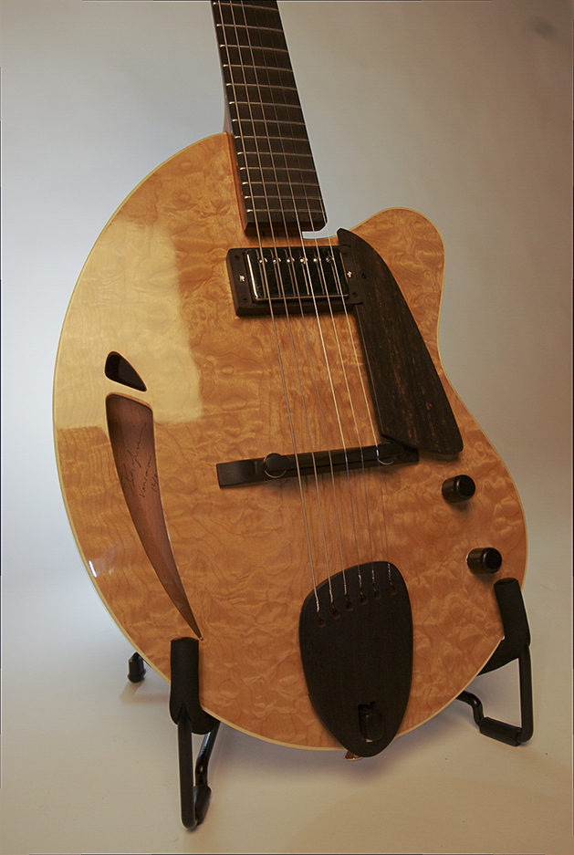 I specialize in acoustic and semi-acoustic archtop guitars but have been known to build the occasional Five Course Baroque instrument. I generally employ a baroque-style back consisting of arched strips on my archtops which contributes to a light, resonant instrument where the back is more than just a reflective surface. In the “on the bench” section you’ll be able to see things taking shape. Please feel free to contact me with any questions or inquiries. Thank you for stopping by!